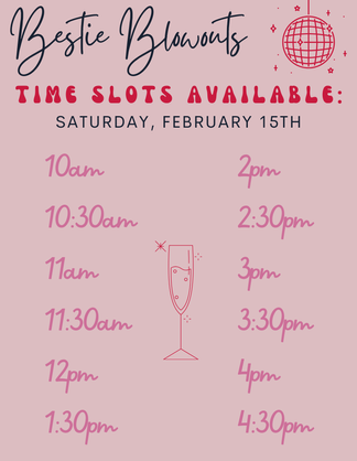 Grab your bestie, it’s blowout o’clock! 💕Get ready to slay the day with Bestie Blowouts, the ultimate Galentine’s Day glow-up event. Treat yourself (and your ride-or-die) to a day of pampering, goodies, and fab hair vibes. Because your friendship deserves ALL the sparkle ✨.